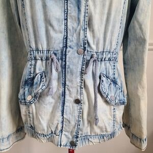 Stay stylish with this trendy acid wash denim lightweight jacket! This versatile parka-style piece features a light blue bleached wash and a functional design, perfect for layering during spring or fall.