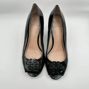 Tory Burch Lowell Wedge Heels Womens 7M Black Patent Leather Peep Toe Luxury CEO