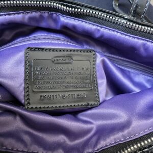 Purple fabric lining. Patent leather straps with silver-toned hardware and a black Coach hangtag.