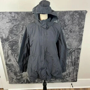 Eileen Fisher Hooded Rain Jacket Black Women's L Nylon Cotton Cinched Coat