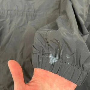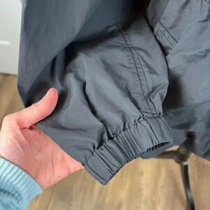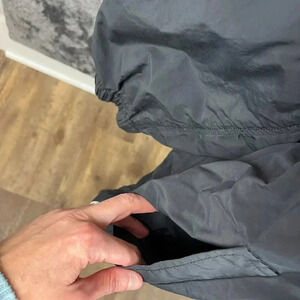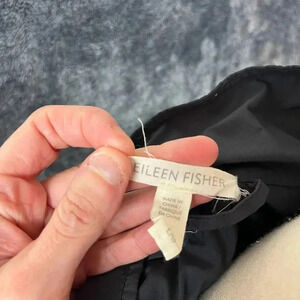 Eileen Fisher Hooded Rain Jacket Black Women's L Nylon Cotton Cinched Coat. **There is a white stain on one sleeve as shown in photos and the brand tag stitching has come off on one side. No other flaws noted. Refer to all photos for condition and sizing.