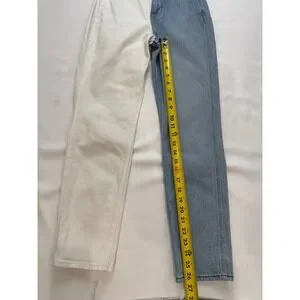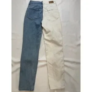 These striking Hollister Ultra High-Rise Mom Jeans feature a bold two-tone split design, combining a crisp white leg with a classic medium wash blue denim. Crafted from Hollister Vintage Stretch denim, they offer a comfortable yet structured fit that hugs the waist and relaxes through the leg for that iconic retro silhouette. The high-waisted cut is incredibly flattering, making these a standout piece for any wardrobe. This pair is in excellent condition, showing minimal signs of wear and maintaining its vibrant contrast. Perfect for school days, weekend hangouts, or a casual concert look.