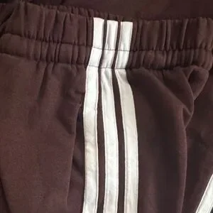 Stylish Adidas women’s fleece joggers. Chocolate brown with white stripes. Elastic waistband and drawstring for comfort.