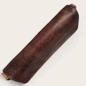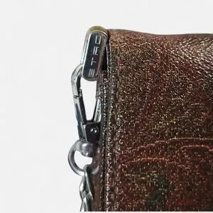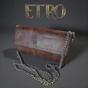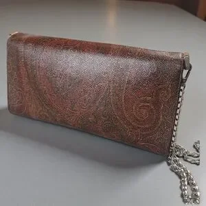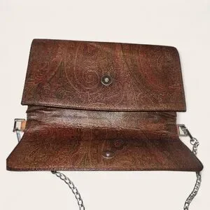 Chic brown clutch with intricate patterns. Features a sleek silver chain. Ideal for stylish outings.