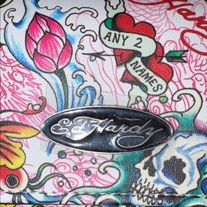 - Bold Ed Hardy clutch with tattoo-inspired design. Features pink and blue accents. Eye-catching accessory for any look.