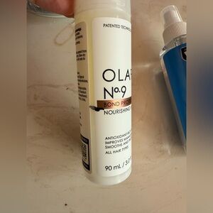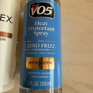 Enhance your hair care routine with the Olaplex #9 Hair Serum and Alberto VO5 Heat Protectant Spray. The Olaplex serum, in a sleek white bottle, nourishes and protects your hair. Complement it with the Alberto VO5 spray in a stylish to guard against heat damage. Achieve smooth, manageable hair with this powerful duo.