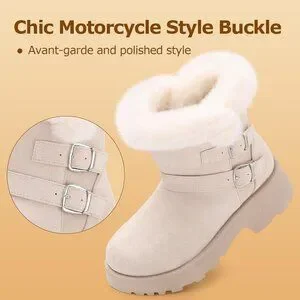 Women's Chunky Low Heel Snow Boots With Fashion Buckle Slip-On Booties Beige