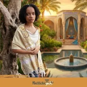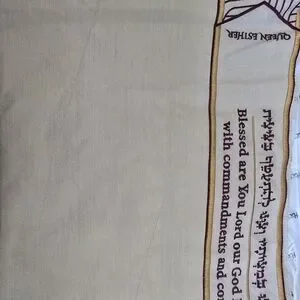 Elegant cream tallit featuring Hebrew letters and artistic designs. Queen Esther Tallit Prayer Shawl 72"x 22" with Bag
