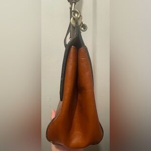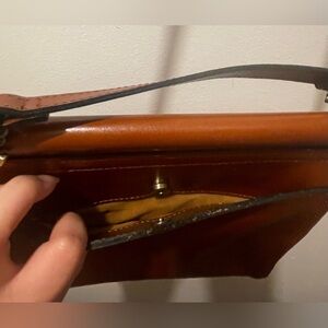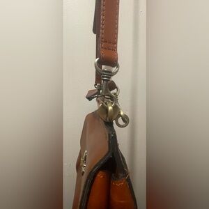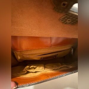 Stylish tan leather crossbody bag. Features elegant floral detail. Perfect for everyday use.