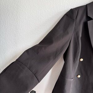 Elegant black blazer. Features gold buttons. Perfect for formal occasions.