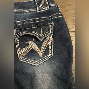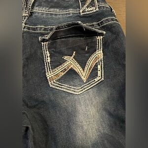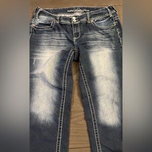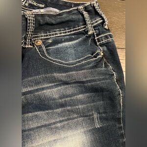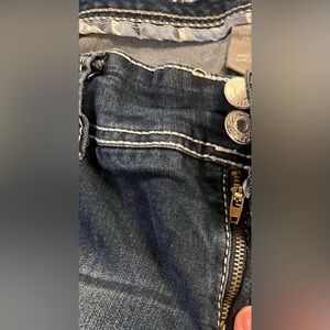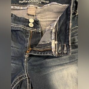 These jeans are in pretty good preowned condition and have been well cared for. They may have some minor cosmetic flaws such as very small and/or light stains on legs but nothing major seen! The button that should hold the right rear pocket shut has broken off and is no longer on pants, that is really the only major flaw.