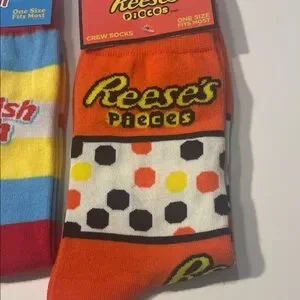 Enjoy a playful touch to your wardrobe with this set of crew socks featuring Sour Patch Kids, Swedish Fish, and Reese's Pieces designs. Perfect for adding a pop of color to your outfit.