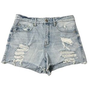 Cut off short. High rise. Light wash denim. Raw edge hem detailing with destruction. Not stretchy Jeans.