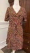 Animal print dress. V neck with snap on chest. Ties on waist. Short sleeves. Lined. Ruffle trim.