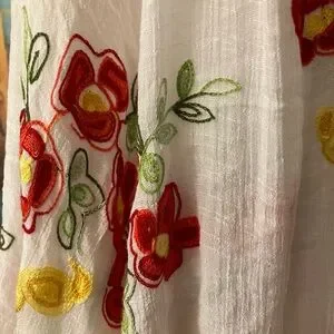 Charming blouse with red and yellow floral embroidery. Lightweight and stylish. Ideal for any occasion.