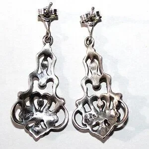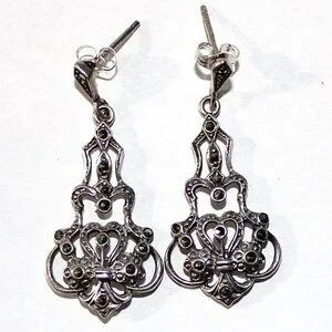 Sterling silver earrings in an art deco chandelier design and set with tiny marcasite stones.