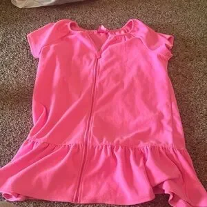 Bright pink kids cover up with a up from and bottom ruffle. Size is 12-14