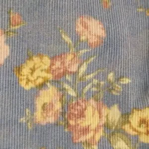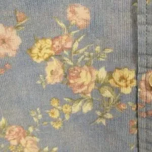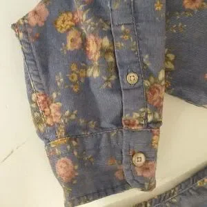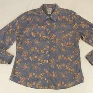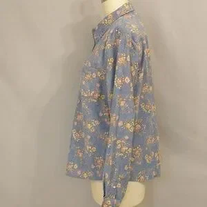 Feminine and practical a 100% cotton fine wale corduroy button down shirt. Single front pocket. Marked size L, please go by measurements for fit. Length 27 ", pit to pit 22", center of neck to wrist 33.5". Condition excellent no excess wear, stains or damage. Soft periwinkle blue color with muted pink and yellow sprays of flowers, full bloom roses. Soft fabric.