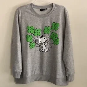 Comfortable Peanuts sweatshirt with SNOOPY holding SHAMROCKS. Perfect for St. Patrick’s Say!!!