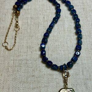 Beautiful blue beaded necklace featuring rich lapis-style stone beads and a gold-tone bee charm centerpiece. The deep cobalt and teal tones give this piece a classic yet boho feel — perfect for everyday wear or layering.