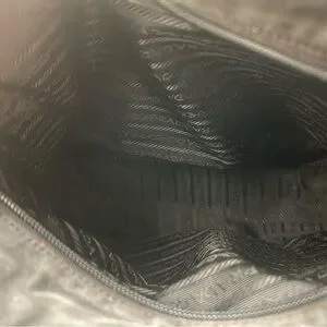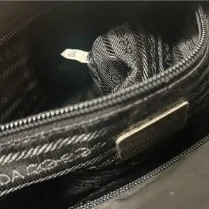 Elegant black Prada bag. Features iconic logo. Sleek and versatile design.