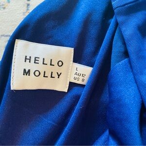 Cobalt blue ruched one shoulder mini dress wirh one sheer long sleeve in ink blue. EUC. Size large measures shoulder to hem 38”, armpit to armpit 16”, waist 11”
