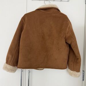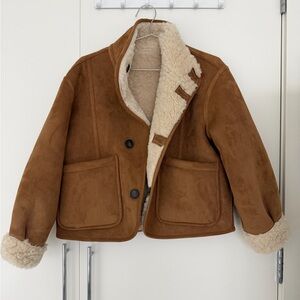 Reversible jacket with a high collar and long sleeves. Front pockets. Combined faux suede and borg fabric detail. Front button closure.