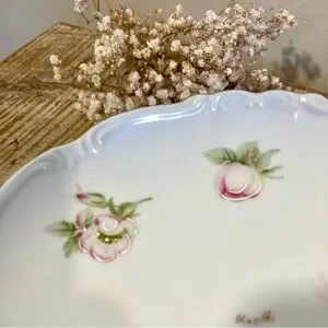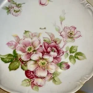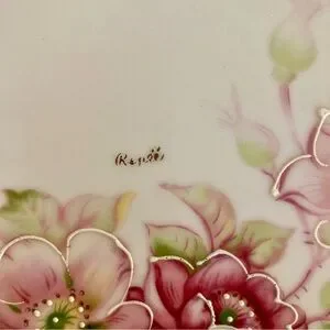 Floral pedestal cake stand featuring pink flowers on a white background with gold colored trim. Signed Renee.
