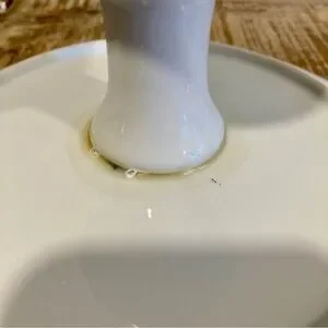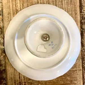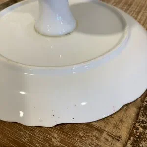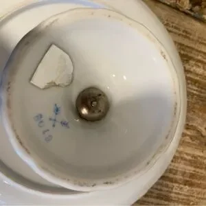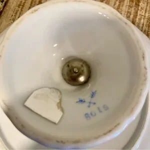 Condition: Used, has no chips or cracks. Lots of discoloration around the gold tone rim and speckles of paint or glaze on the white parts. The glue on the underside has bubbles in it, but still remains sturdily attached.