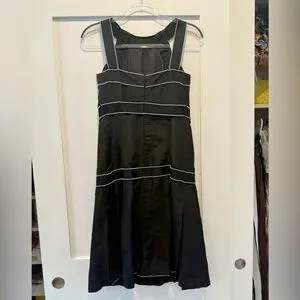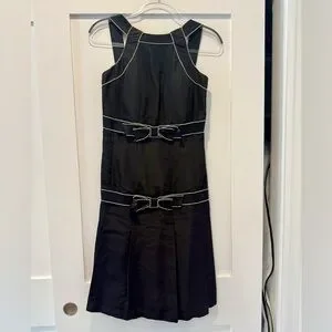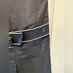Karl Lagerfeld- era black silk dress with pearl embellishment throughout, bow details at the center, and pleated skirt. CC charm is stitched into bottom left bow.