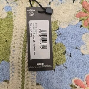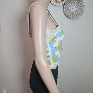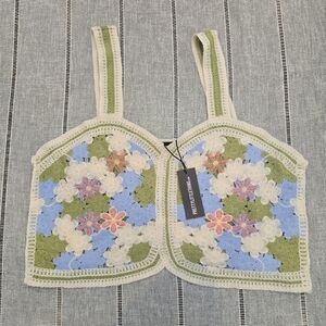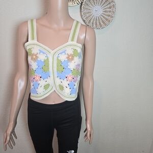 Chic and stylish floral crochet top featuring a blend of cream, blue, and green. Perfect for a casual day out.
