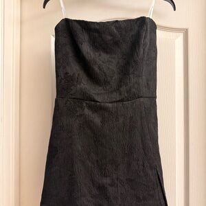 Lulus Charming Ideal Black Jacquard Organza Strapless Tie-Back Romper! Sleek woven jacquard, with a floral motif throughout, shapes a strapless bodice with hidden no-slip strips. NWT
