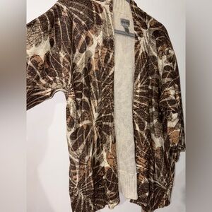 Elegant open front cardigan with a nature-inspired pattern. Perfect for layering.