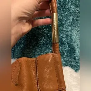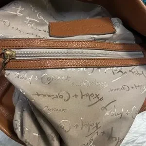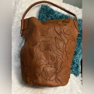 Foley + Corinna Lilli bucket tote in honey brown. Tan leather exterior with a gorgeous floral design. Inside lined with zip pocket and tech pockets. Strap wit stamped Foley + Corinna gold accent. Magnetic button closure. Few light marks on bag, nothing major, see pictures. Approx measurements in pictures.
