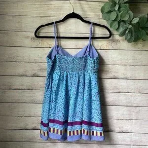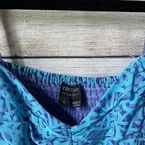 nicole spaghetti strap dress. Size 4. Adjustable straps, lined, side zipper closure. Blue/ purple in color/ pattern. 100% polyester in material.