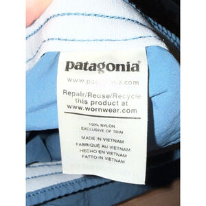 VINTAGE BAGGIES! These are a pair of men's Patagonia athletic shorts in a shade of blue, size XL, as indicated by the visible tag. The shorts feature an elastic waistband and two side pockets. The Patagonia logo is stitched onto the lower left leg. The material appears to be 100% nylon, as stated on the care tag, and the shorts were made in Vietnam. The fabric shows some minor creasing consistent with pre-owned apparel.