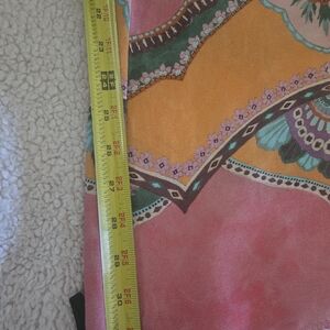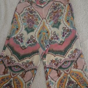Stylish wide-leg pants with a vibrant paisley pattern. Features pink, orange, and green tones. Ideal for a standout look.