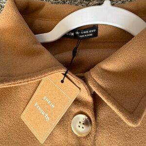 Elevate your wardrobe with this chic tan jacket. Perfect for any occasion, it offers both style and comfort. New with tags - size large. Bundle multiple items for a discount.