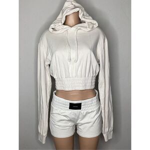 Hoodie with drawstring. Thick cropped waistband with elastic. I have two of these tops and they do not have their tags inside so please see measurements. The waistband is smaller than the size small shorts so I believe these to be extra small. This is for the top only I sell these shorts on my page as well.