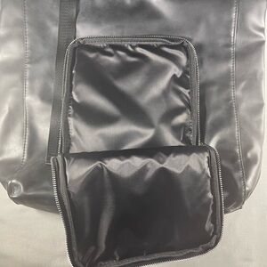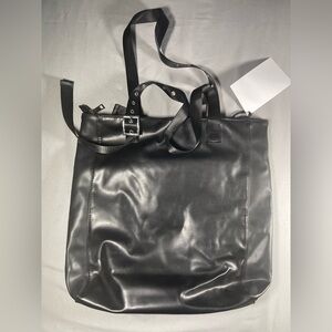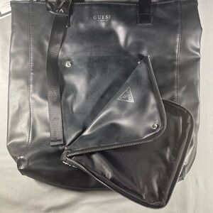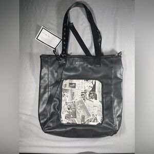 Chic Guess tote with a sleek black finish. Features a striking black and white graphic pocket. Sturdy straps for easy carrying.