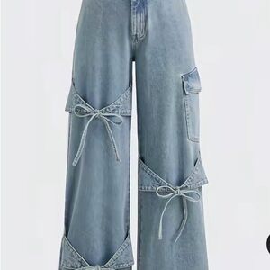Chic blue flare jeans with stylish bow accents. Perfect for a trendy look.