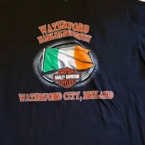Harley-Davidson graphic t-shirt features the iconic Bar & Shield logo on the front and a custom Waterford City, Ireland dealer graphic on the back. The reverse side showcases the Irish flag set against a tire tread background, making it a great find for collectors or fans of international Harley-Davidson apparel. Crafted from comfortable black cotton with a classic crew neck and short sleeves, this 2009 dated shirt offers a timeless biker aesthetic with a unique geographic touch. Fever worn but no tags.