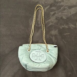 Chic light green bag with elegant gold chain straps. Features signature Tory Burch logo.
