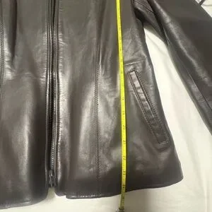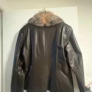 Stylish brown authentic leather coat featuring a luxurious fox fur collar. Perfect for a sophisticated look.