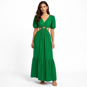 Keywords: Boho, Festival, Tropical, Vacation, Summer, Cutout, Ring Detail, Puff Sleeve, Tiered, Maxi, Kelly Green, Bohemian, Beachy, Airy, Flowy