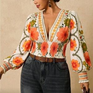 Plus Size Romantic Bohemian Floral Print Long Sleeve Tie Front Blouse Shirt