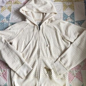 This hoodie is so gorgeous! It is a fleece and cotton mix, so it is very soft and fluffy on the inside while maintaining a soft and smooth exterior. Cream fabric with mini gold heart pattern, large gold words on back bedazzled with big rhinestones. Also has a small gold dog, also bedazzled, on front pocket! Old pictures, hoodie string is missing now, will update photos later. Many rhinestones have been replaced by me.
