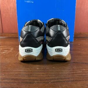 These Skechers sneakers feature a black leather upper with colourful patterned accents.