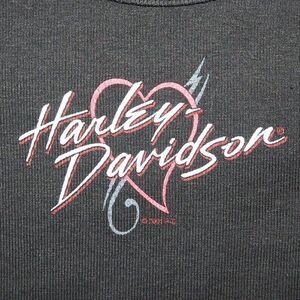 This Harley Davidson vintage top, likely from the Y2K era, offers a unique blend of edgy and feminine style for your wardrobe. Crafted in classic black, this short-sleeved top features a distinctive square neckline accented by intricate red lace detailing on the shoulders. The iconic "Harley-Davidson" script is embroidered in red on the chest, adding to its brand appeal. Made from a comfortable knit fabric, this top provides a flattering fit, perfect for adding a touch of biker chic with a delicate lace contrast to your look wherever you ride.