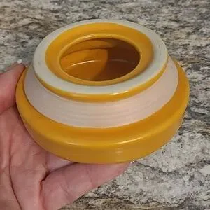 Plastic gasket on a lid for tighter fit. Handle on top.